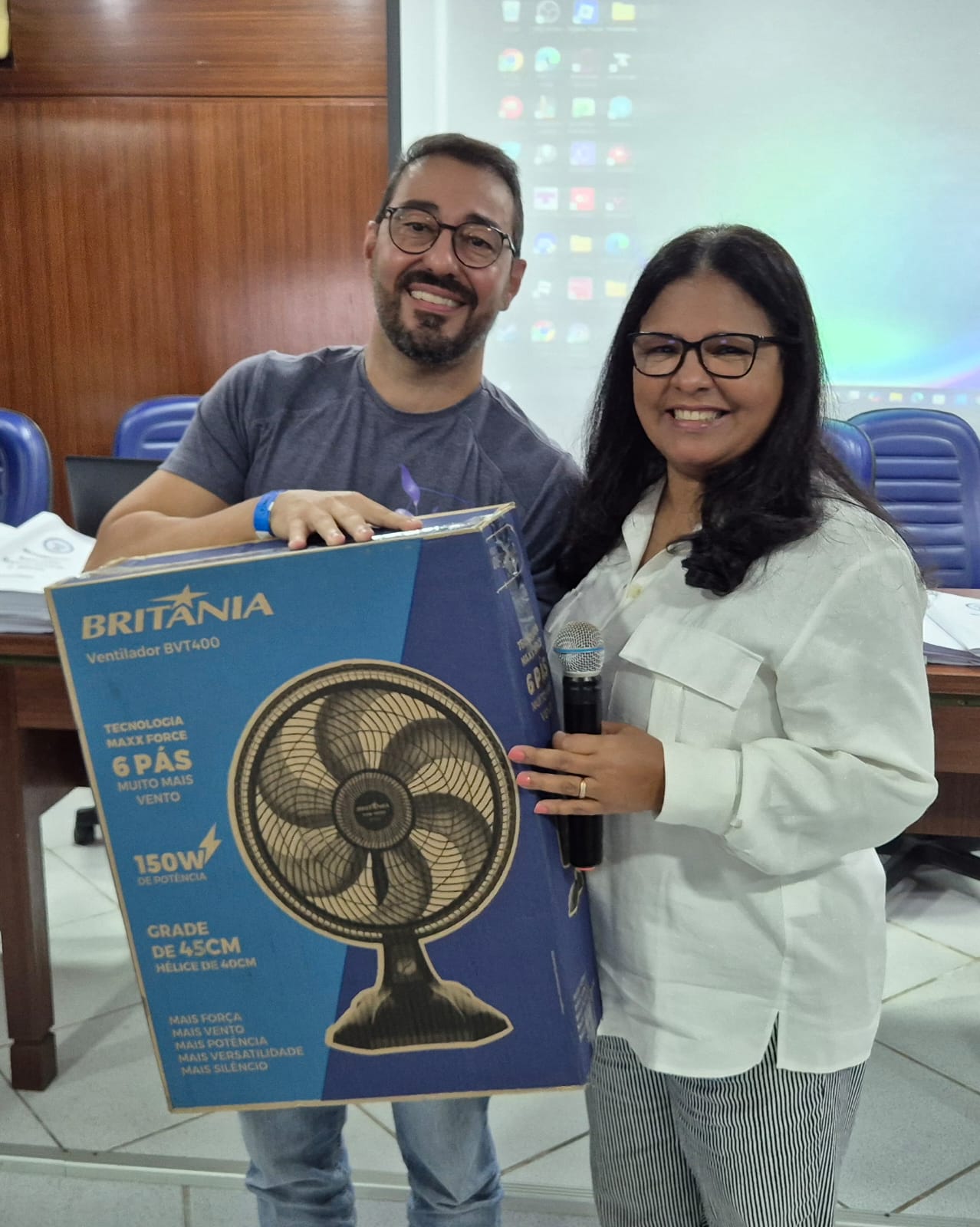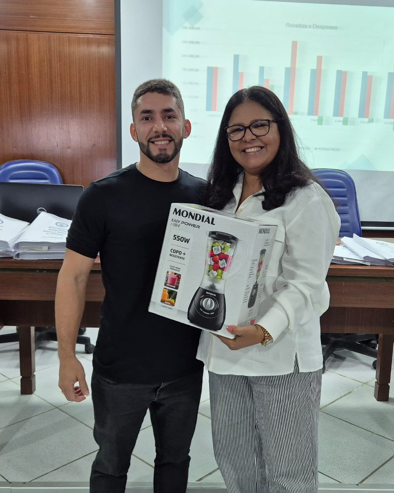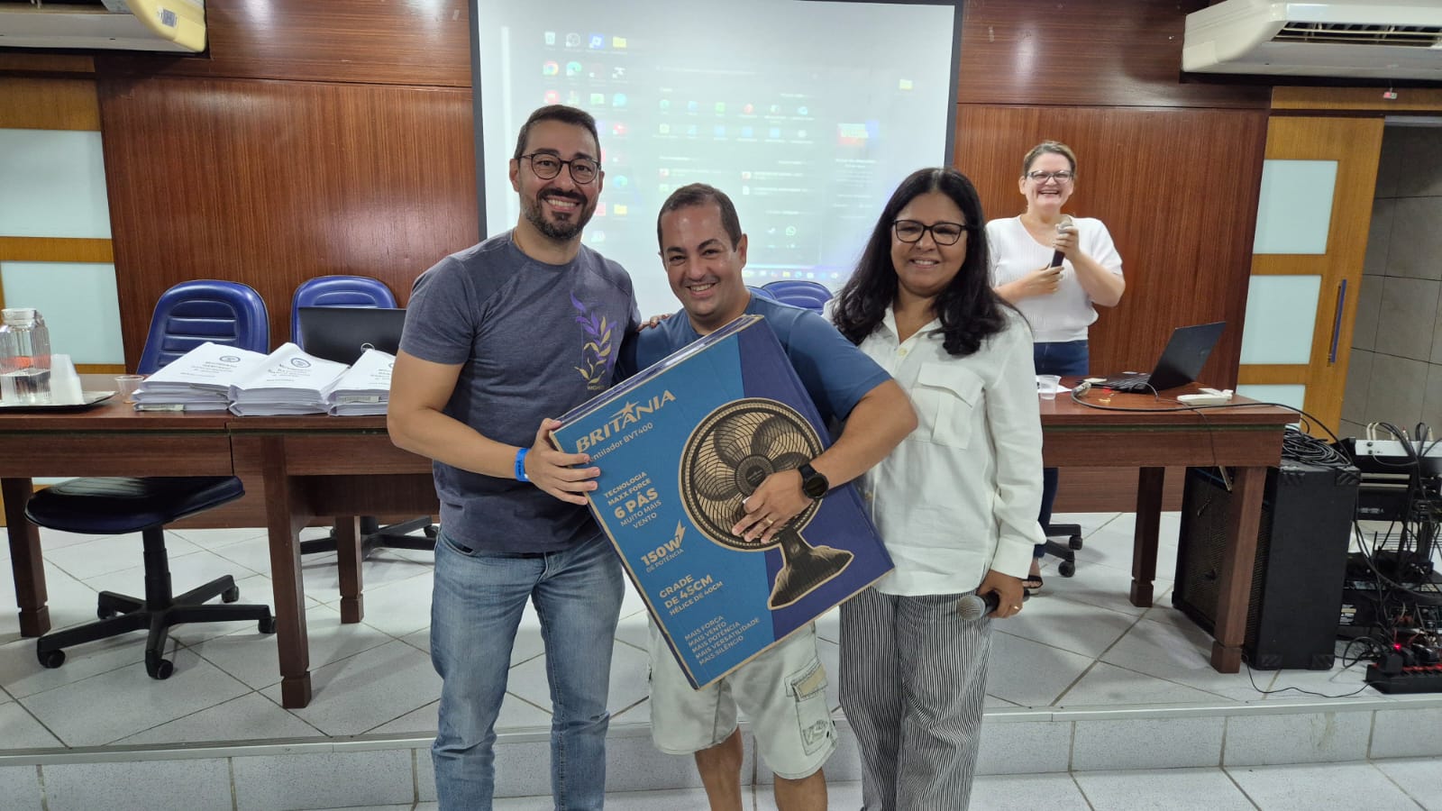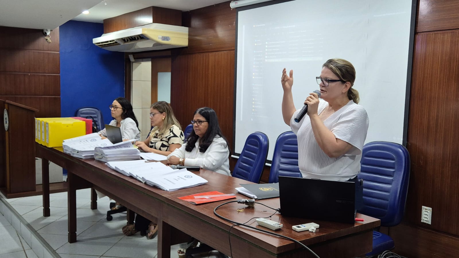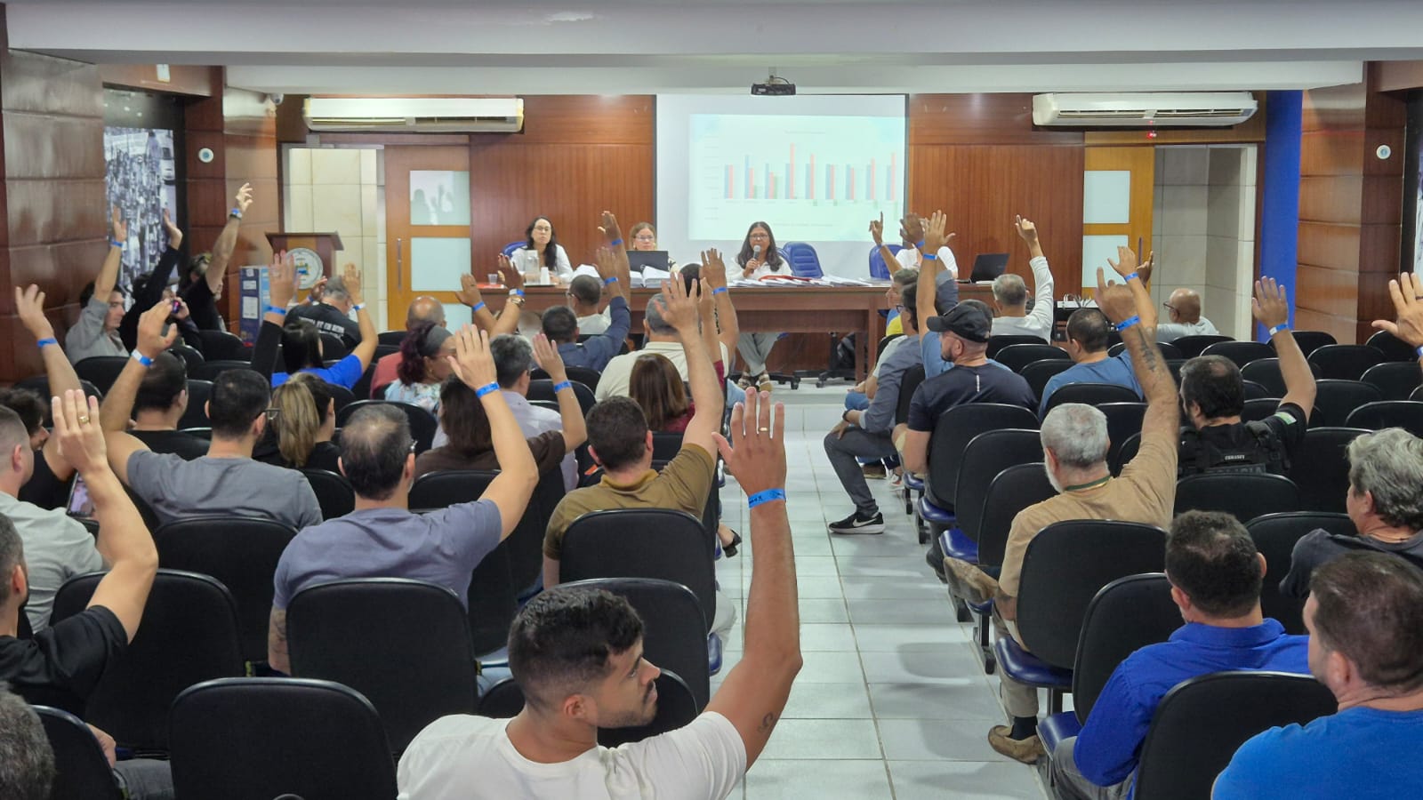 Após abrir os trabalhos, o presidente do sindicato, Nilton Arruda, passou a condução da Assembleia para Edilza Faustino, presidente da época, que fez a apresentação da prestação de contas juntamente com Eva Carvalho, que era diretora financeira do referido período.